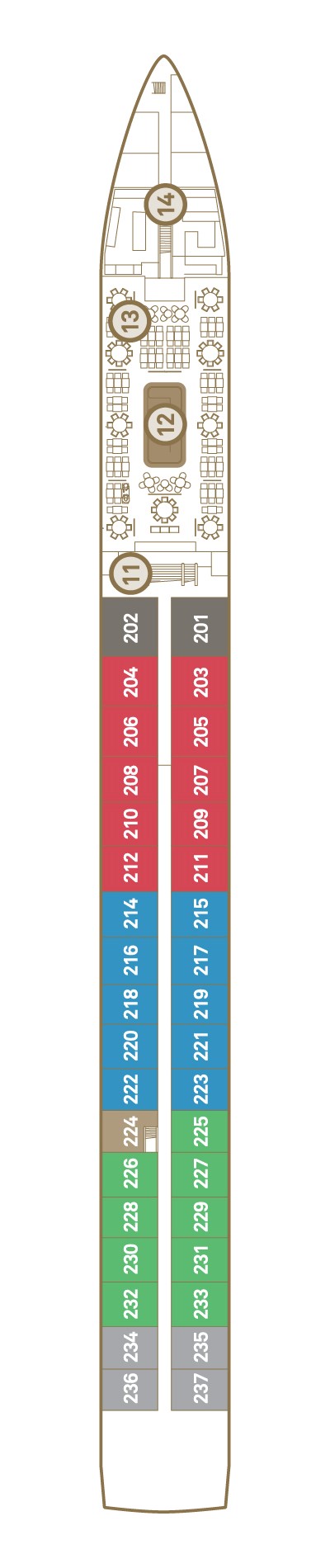 To help you gain greater insight into the space and layout of our newest fleet members, you’ll find the deck plans for Scenic Jasper, Opal and Amber below. Spanning a total of four decks, these sister vessels boast a wealth of public entertainment, dining and wellness areas, as well as the state-of-the-art Vitality Pool to be found on the all-weather Sun Deck.