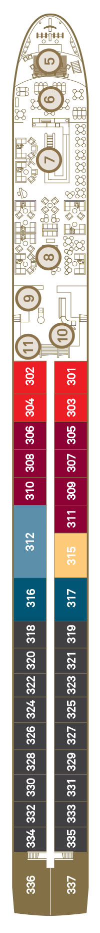 Located on the Jewel Deck, these suites feature butler service, early morning tea and coffee service, and a picture window to gaze out at the passing views.
