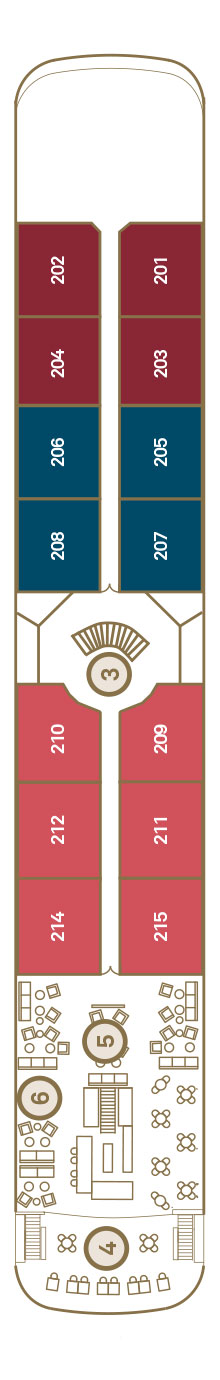 The ship comprises five decks connected by a central atrium and elevator, allowing uninterrupted access for all of the 68 passengers aboard. These include the Gem Deck, Jewel Deck, Sapphire Deck, Diamond Deck and, on the uppermost part of the vessel, the open-air Sun Deck, which is complete with a sleek pool, open air cinema and ample outdoor seating.